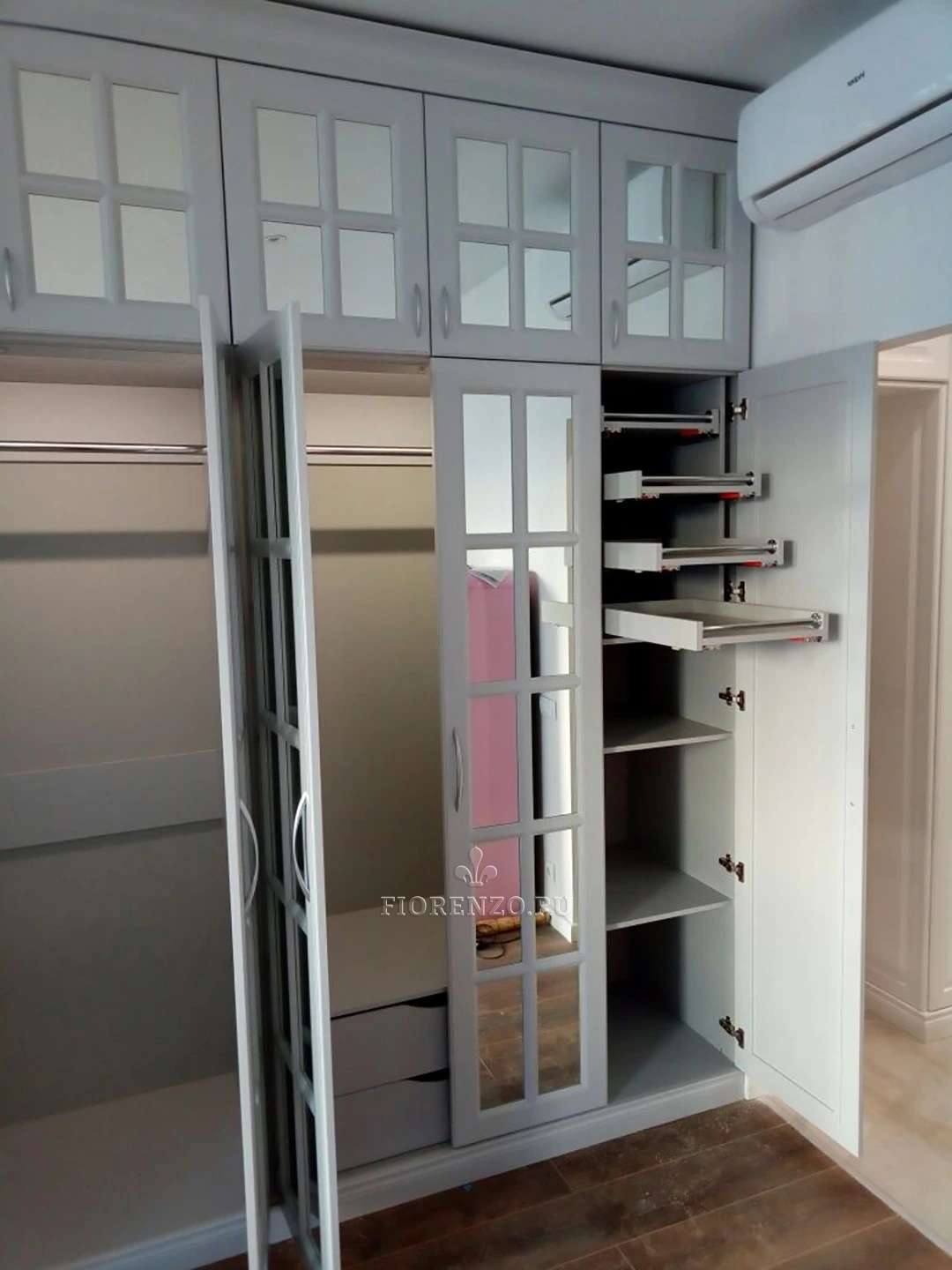 Фасадная часть и декор шкафа в спальню под заказ выполнены из МДФ, окрашенного лаком Sayerlack. Корпус – из экологичных ламинированных плит бренда Egger. Фурнитура – HARN с доводчиками.