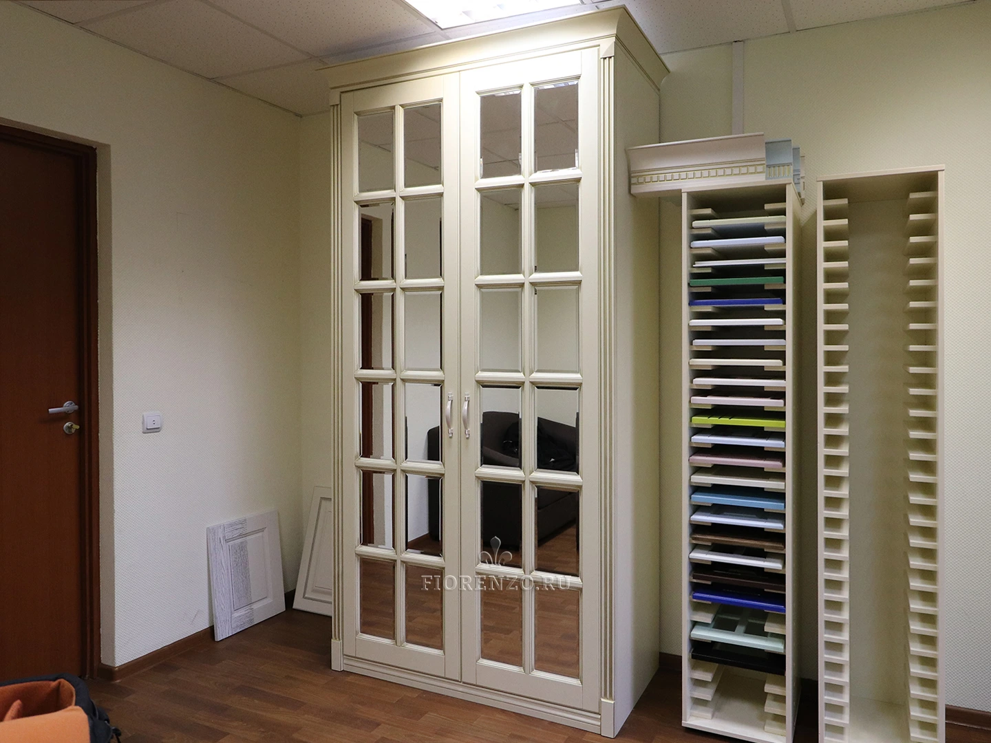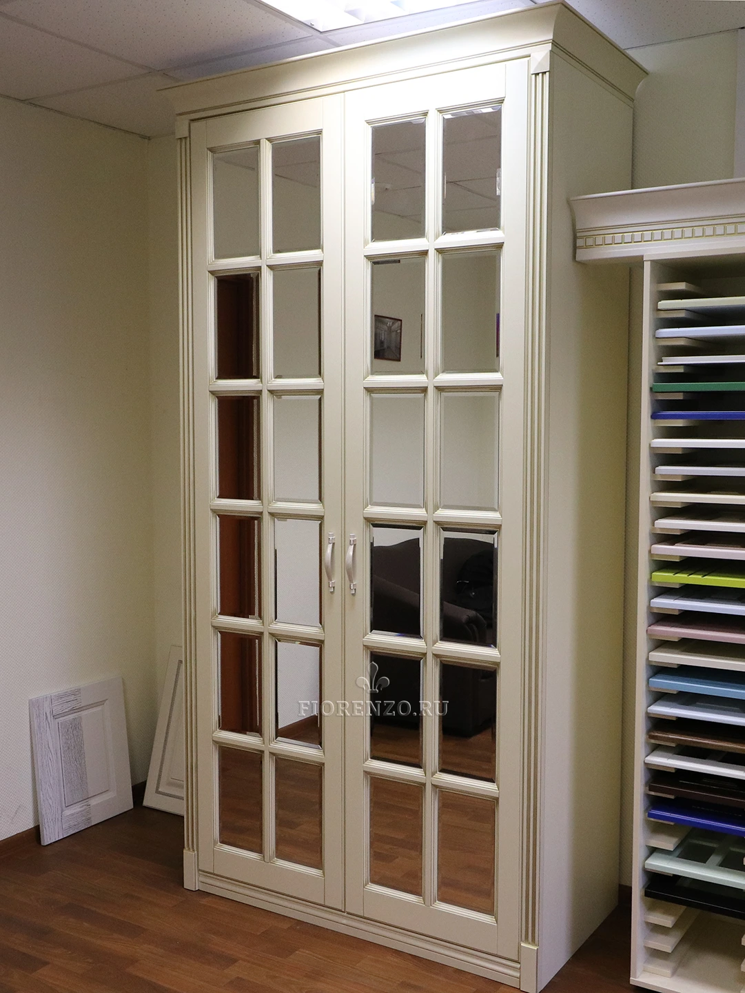 Фасады распашного шкафа под заказ имеют декоративную филенку с фацетами и зеркало, которое визуально расширяет пространство, делает его просторней и светлей. Дизайнеры «Фиорензо Мебель» могут разработать проект в соответствии с вашими стилевыми предпочтениями, адаптировать его размеры под особенности помещения, где он будет установлен.