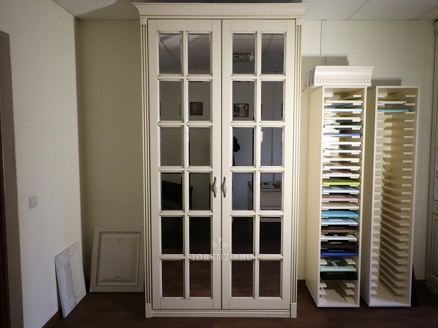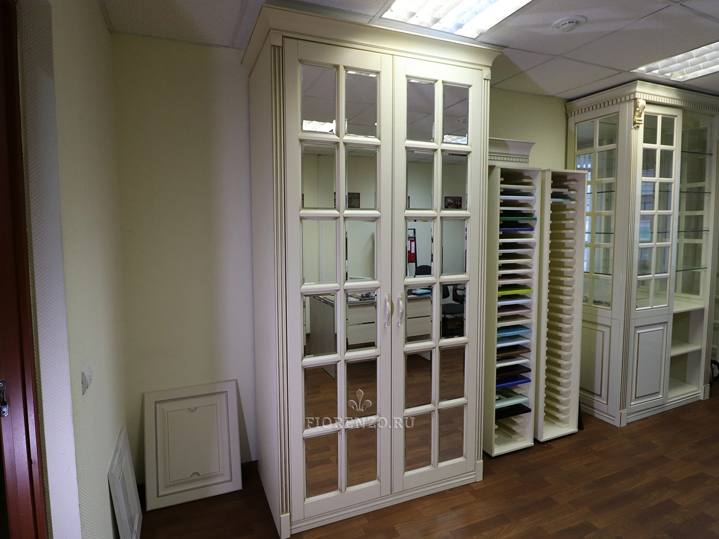 Видимые части и фасады сделаны из МДФ, покрытого качественной эмалью Sayerlack по каталогу RAL. Внутренние элементы – из австрийского ЛДСП торговой марки Egger. На зеркалах сзади наклеена защитная пленка, предотвращающая высыпание осколков в случае разбития. Петли от австрийской компании Blum c доводчиками.