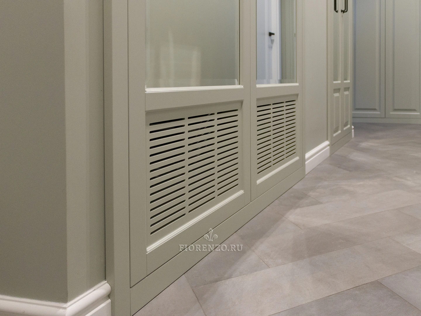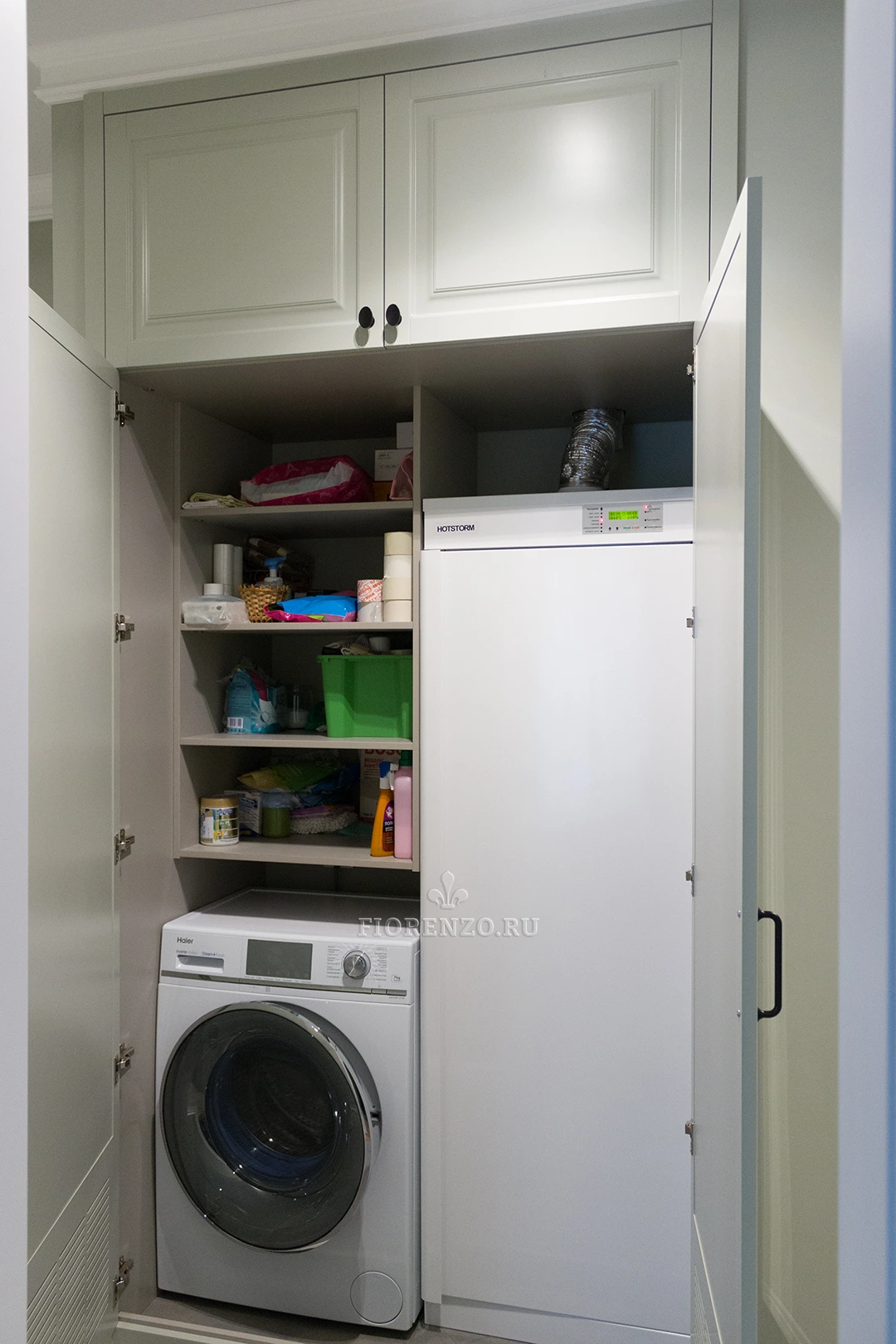Наполнение секций выбирает покупатель – устанавливать в шкафу можно, в том числе холодильник или стиральную машину. Модель встроенная, проектируется под индивидуальные замеры помещения.