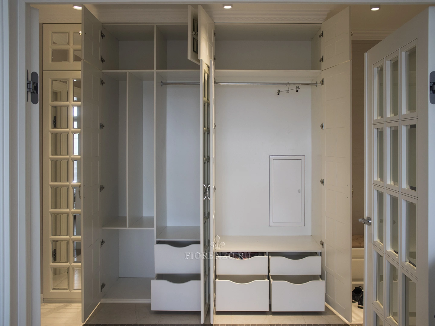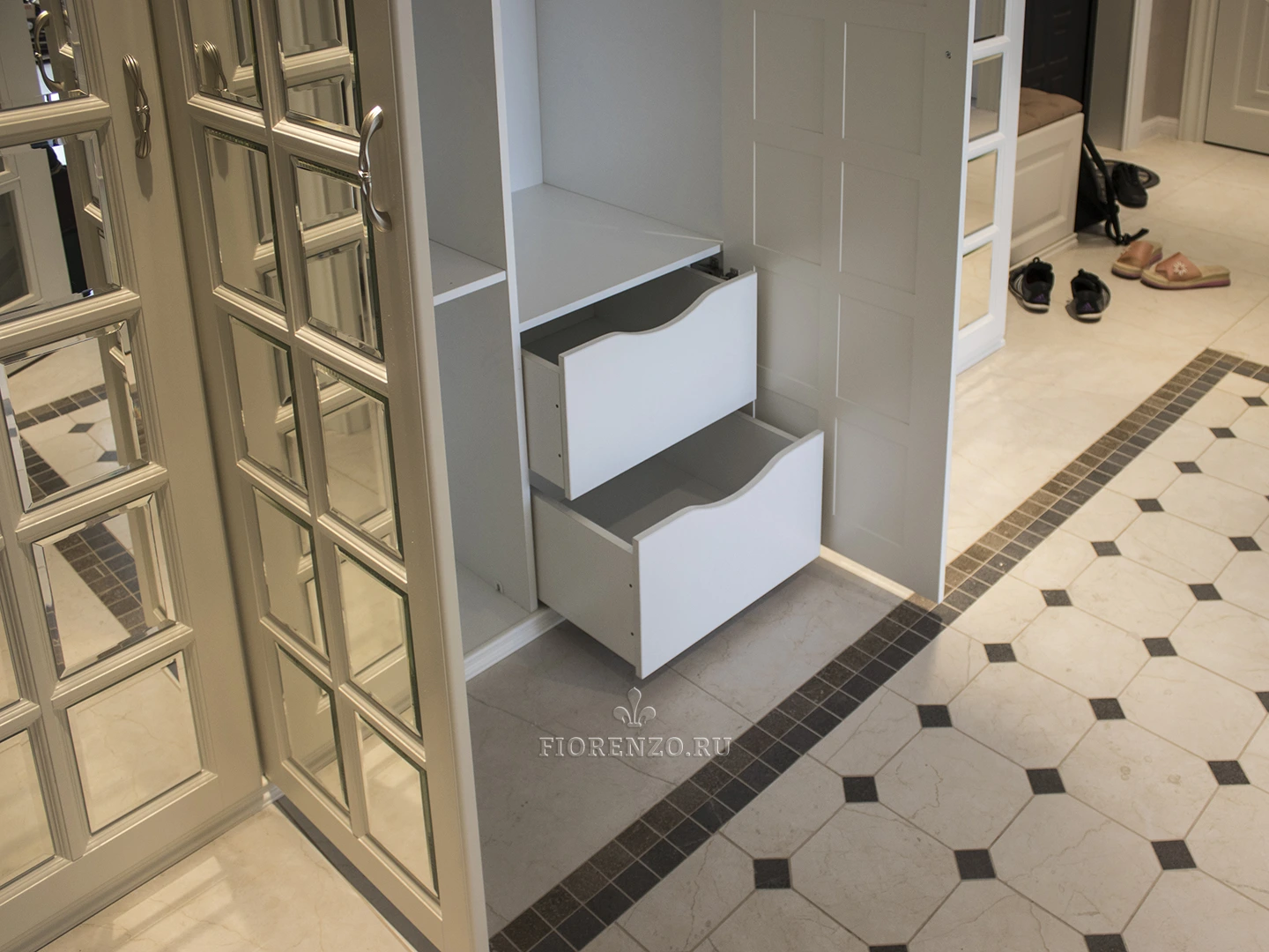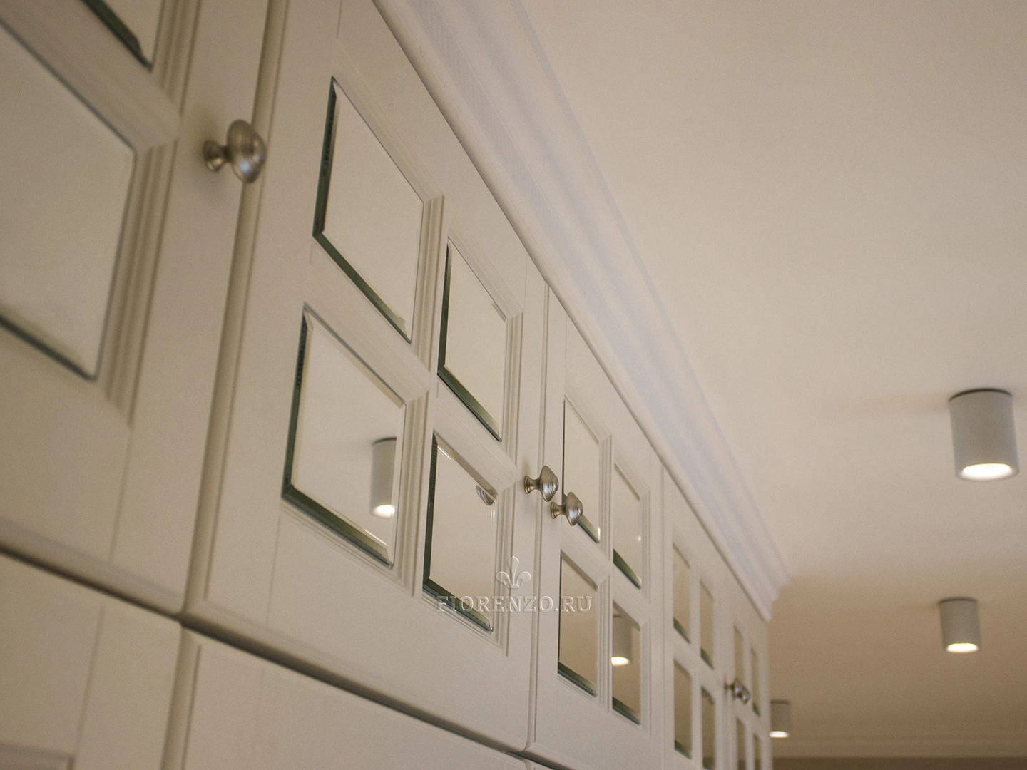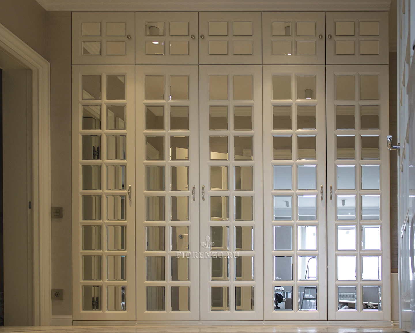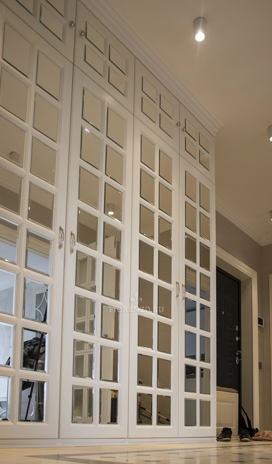 Мебельной фабрикой «Фиорензо Мебель» был спроектирован оригинальный зеркальный шкаф в прихожую «Комо» с декоративной раскладкой на фасадах. Изделие отличается высокой эргономикой и практичностью, внутри есть все необходимое для хранения одежды и вещей семьи из трех-четырех человек. Шкаф встроенного типа размещен в специально подготовленную для него нишу, занимает пространство от пола и до потолка. Фасады с декоративной раскладкой делают изделие подходящим для классических и современных интерьеров, неплохо оно будет смотреться и в помещении стилей хай-тек и модерн. Дизайнеры нашей компании могут разработать идентичный проект для вашего жилья, где учтут все требования и пожелания – вы сможете самостоятельно выбрать расцветки, внутреннее наполнение и материалы.