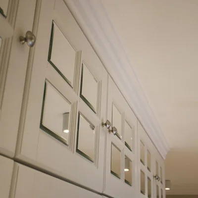 Внутренности и ящики сделаны из ЛДСП компании Egger. Фасады – из МДФ, окрашенного эмалью акрилового типа. Фурнитура – от европейского производителя HARN.