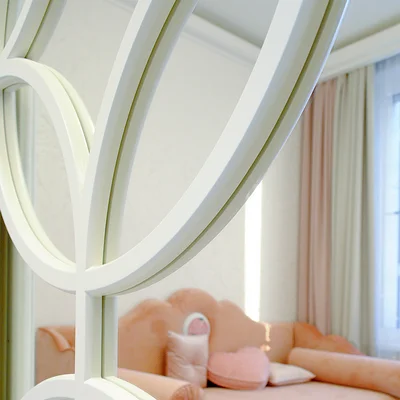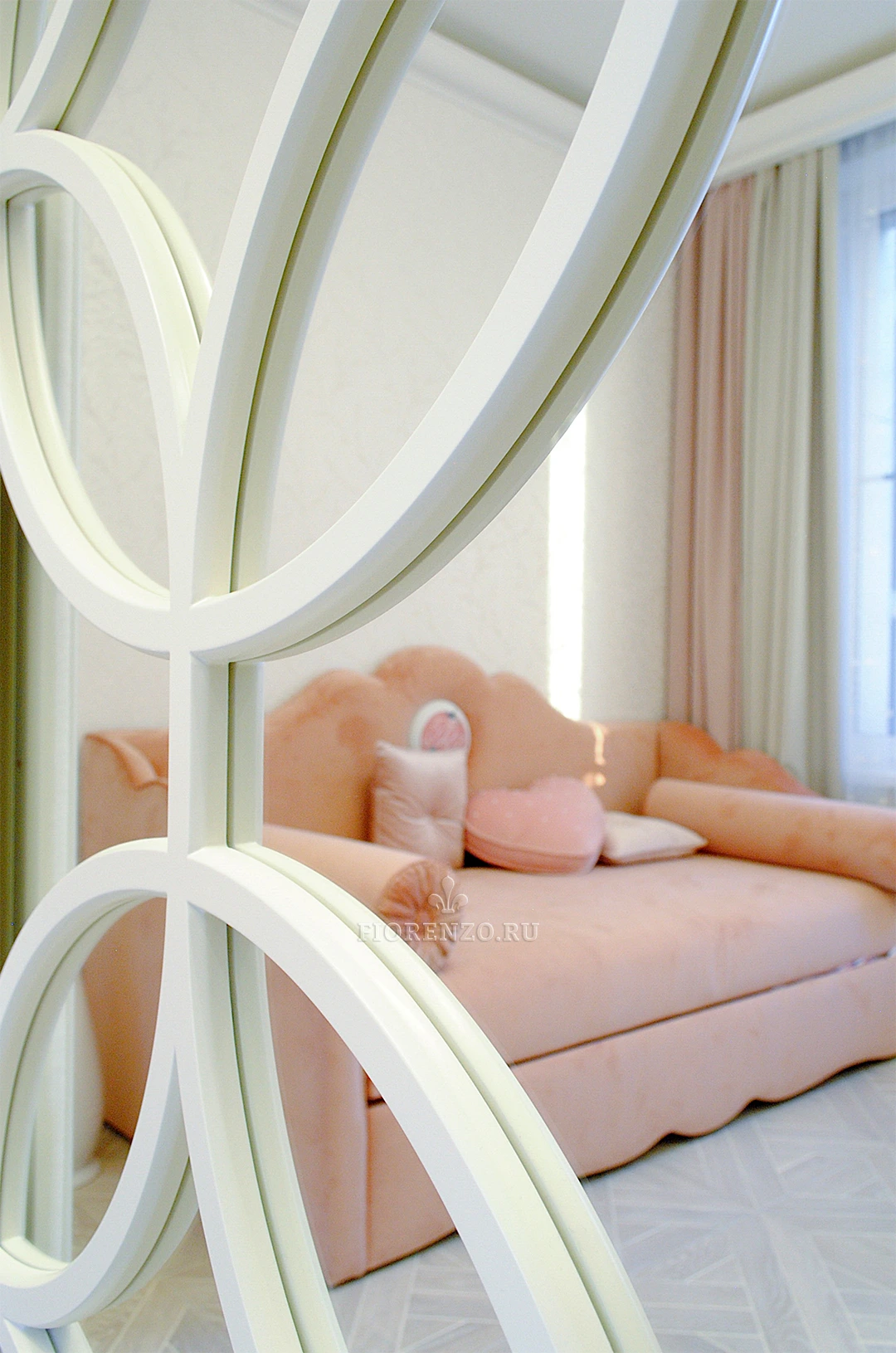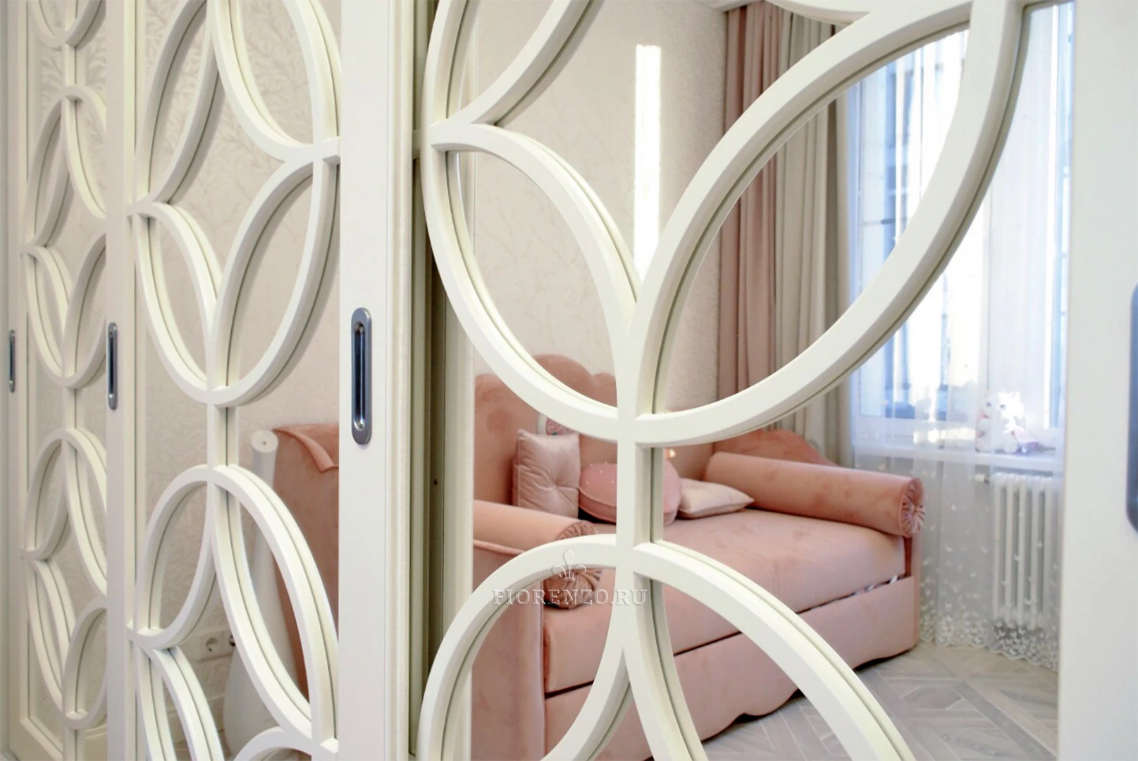 Мебельная компания-производитель Fiorenzo разработала проект шкафа-купе «Остин» в детскую спальню из МДФ с зеркальными дверьми на заказ. Изделие является встроенным, имеет уникальный дизайн, обусловленный оригинальными фасадами с декором, оснащенными практичными врезными ручками. При создании дверок применялось высокоточное оборудование и методика 3D-фрезерования.