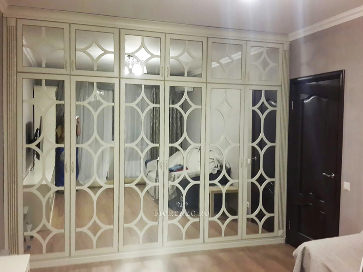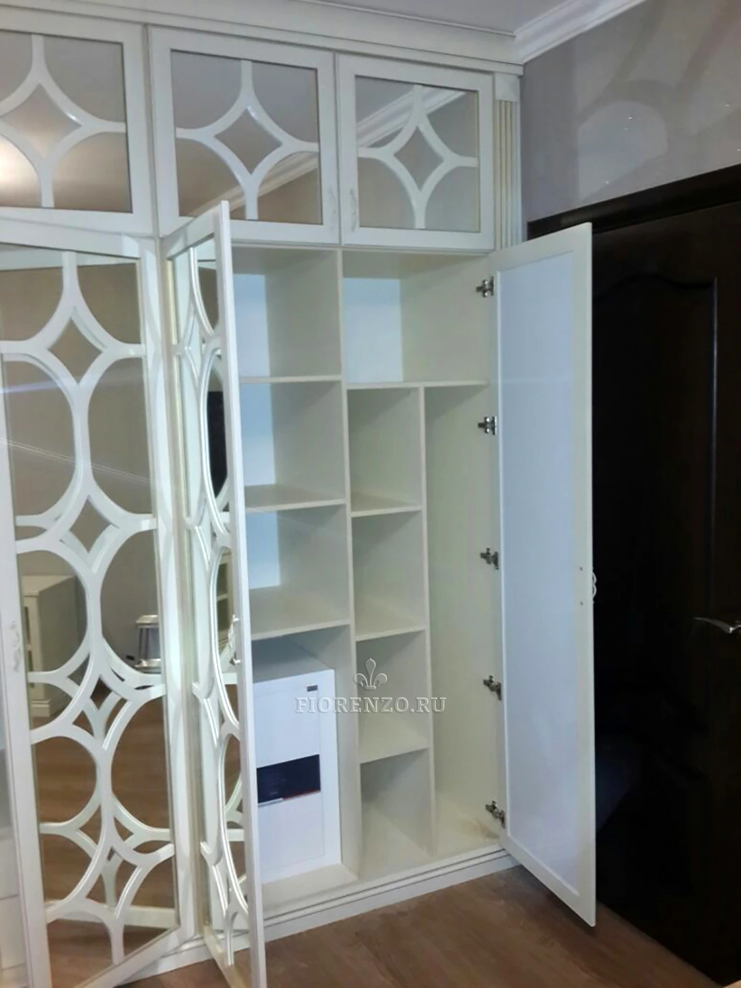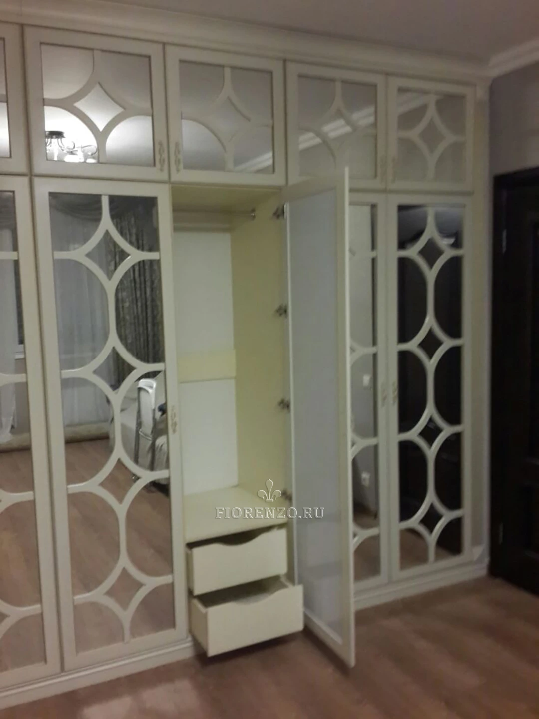 Расположенный в загородном доме, зеркальный шкаф «Макграт» с декоративной раскладкой представляет собой настоящий шедевр, в котором сочетаются такие качества, как практичность, привлекательный внешний вид и эргономичность. Мебель для гостиной изготовлена под заказ, что позволяет ей полностью удовлетворять все требования клиентов. Отдельного внимания заслуживает оформление фасадов – их филенка с зеркальными вставками смотрится оригинально и очень богато. Специалисты «ФиорензоМебель» могут сделать идентичный проект, который идеально впишется в любое пространство, а его внутреннее наполнение будет адаптировано под ваши потребности.