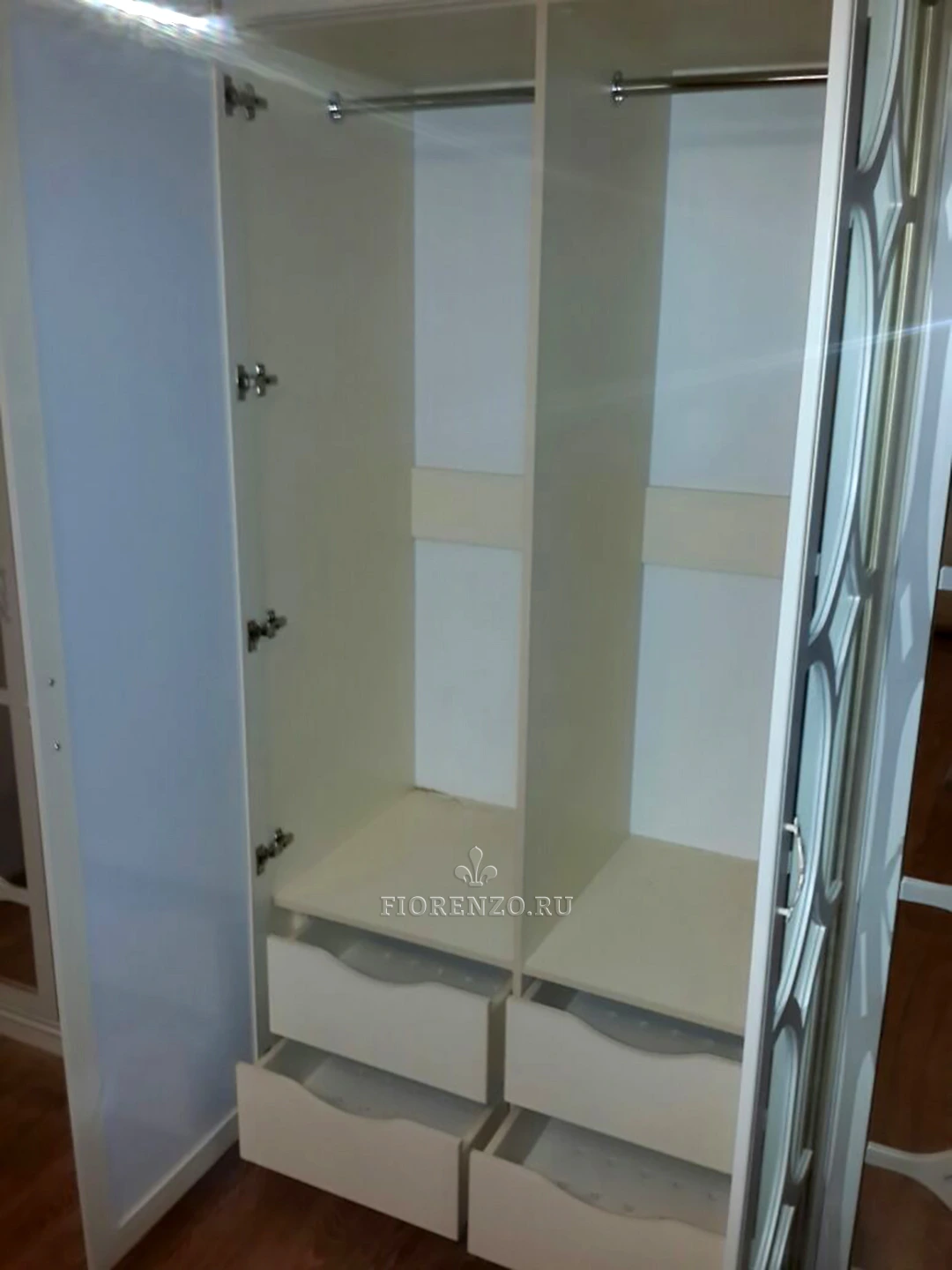 Фасады изготовлены из крашеного эмалью Sayerlack МДФ с зеркальными вставками, защищенными сзади специальной пленкой. Корпус – из ЛДСП Egger австрийского производителя. Фурнитура от компании BLUM с амортизаторами и доводчиками.