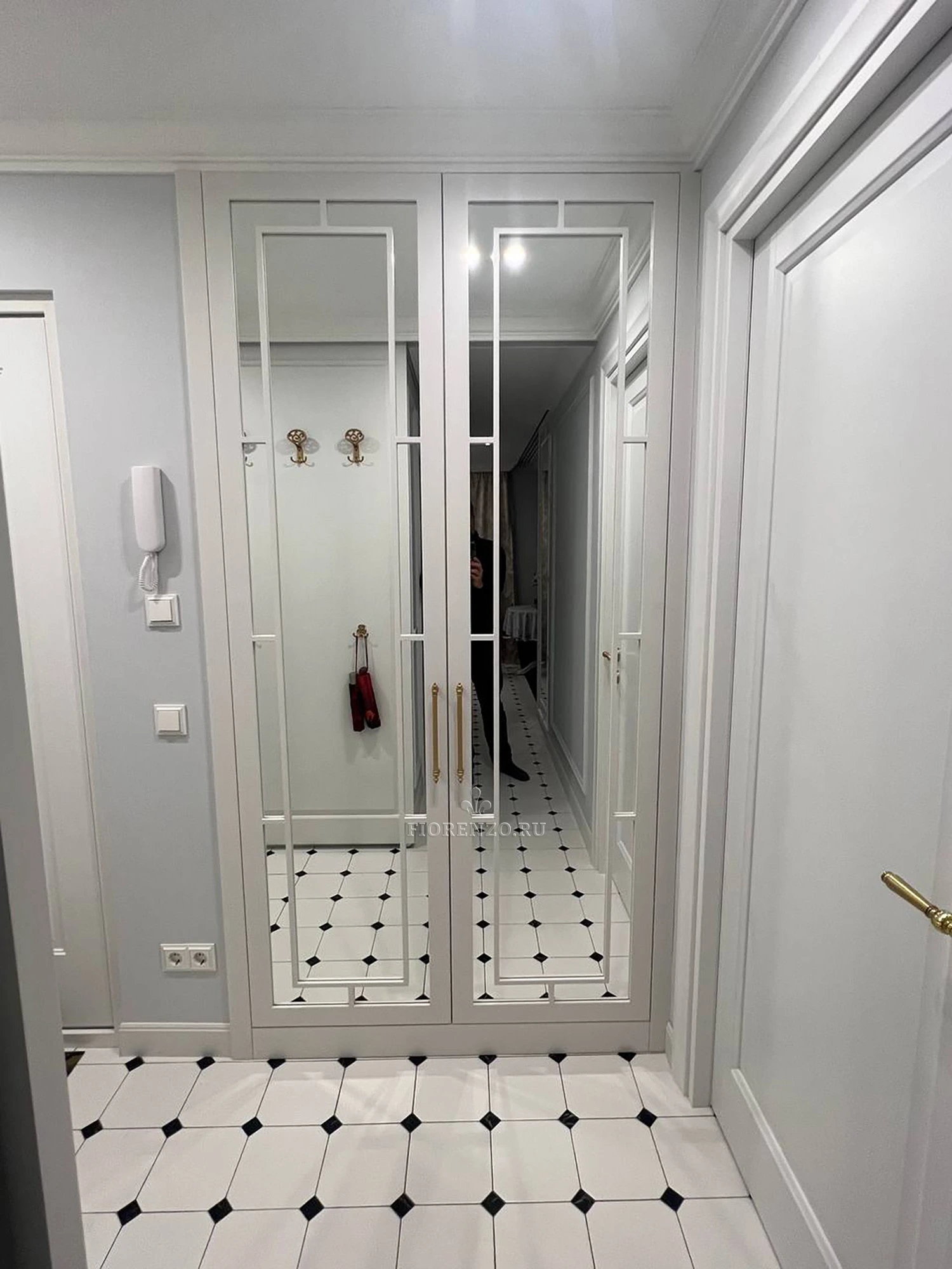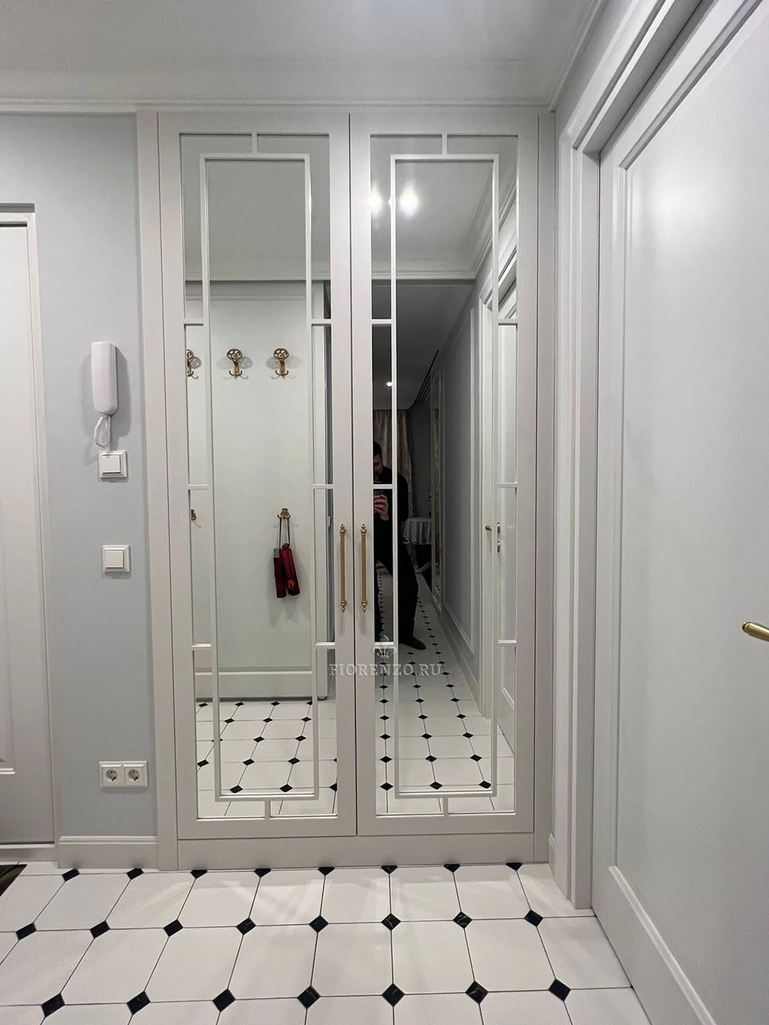 Зеркальные элементы не только практичны, но и служат стильным декоративным решением, гармонирующим с элегантностью неоклассического стиля. Изящные ручки подчеркивают общую элегантность шкафа, а его размеры, изготовленные на заказ, позволяют идеально вписать его в любую нишу.