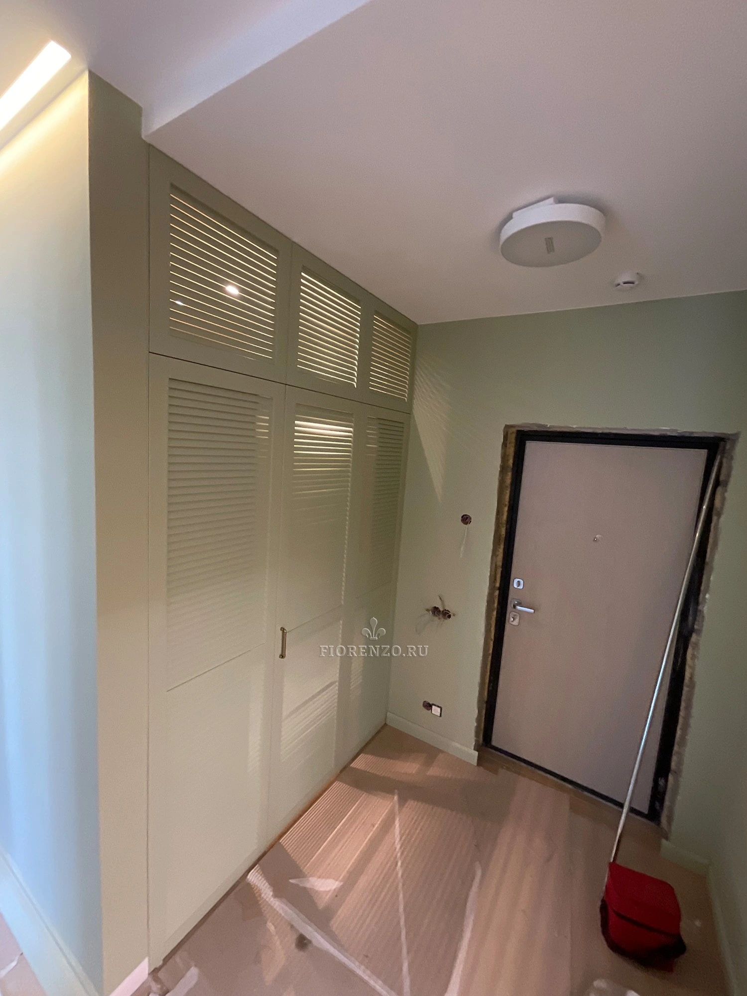 От прихожей гардеробная комната отделяется жалюзийной реечной перегородкой с одной распашной дверцей. Выполнено из МДФ в эмали с окрасом NCS S 0510-B70G